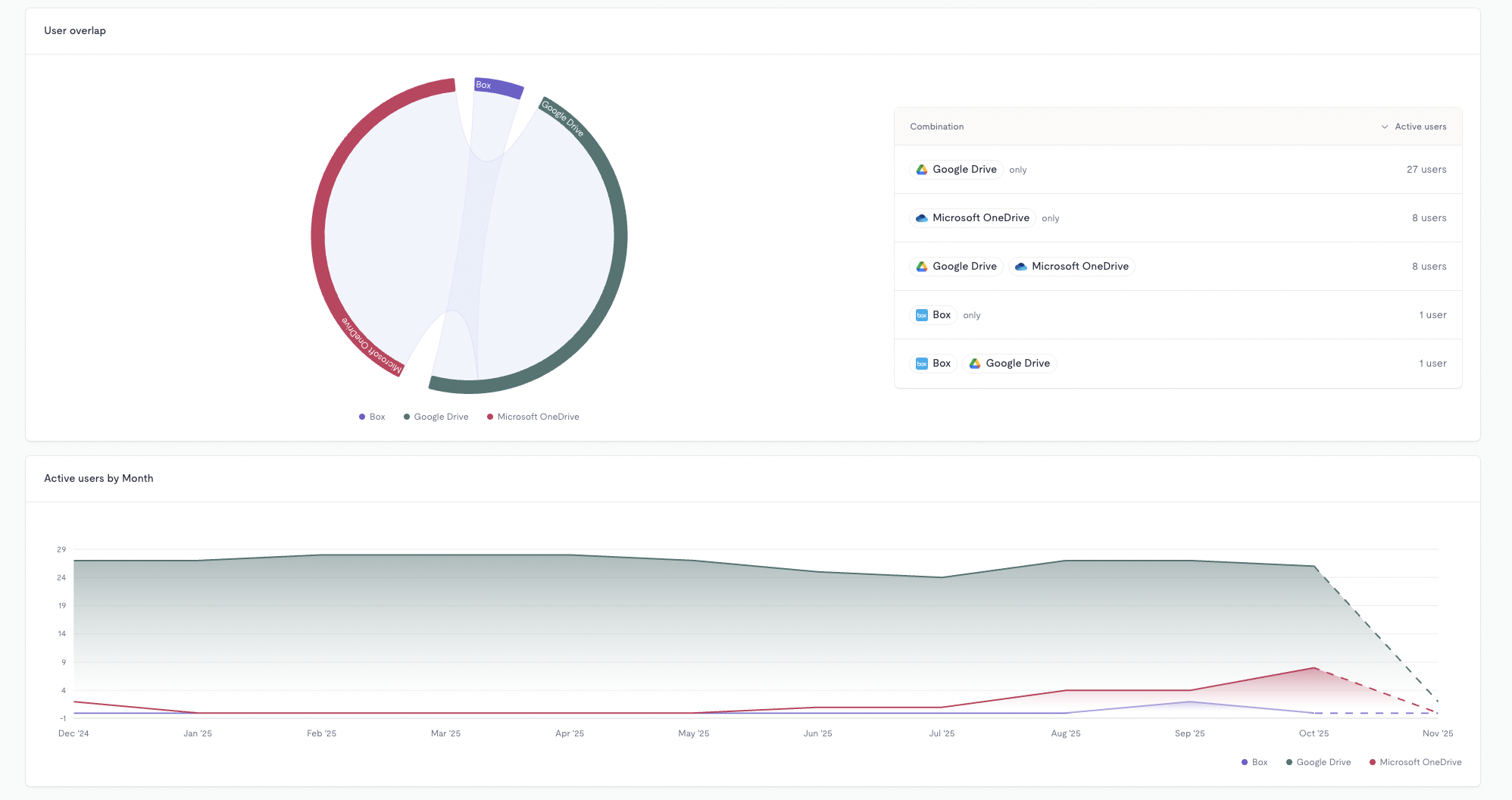 A visual overview of how many users overlap between products helping teams understand whether tools are used by the same cohorts or by entirely different groups.